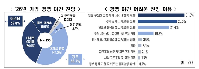 22일 한국경제인협회가 모노리서치에 의뢰해 매출액 1천대 기업을 대상으로 실시한 '2026년 기업 경영환경 인식 조사(150개사 응답)' 결과, 응답기업의 과반(52.0%)은 내년 경영여건이 어려울 것으로 전망했다. '매우 어려움'을 전망한 기업도 전체 응답의 18.0%로 나타났다.