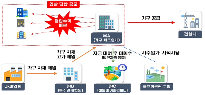 또한, 가구자재 매입 과정에서 특수관계법인인 ㈜B를 거래단계에 끼워넣어 고가에 매입하는 방식으로 특수관계법인에게 이익을 분여한 혐의도 드러났다.