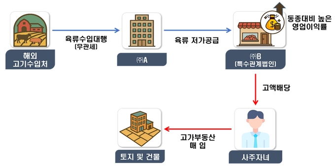 ㈜A는 할당관세를 통해 저렴하게 확보한 수입육을 ㈜B에게 업종평균 대비 절반의 마진율만 남기고 시가보다 저가에 공급해 이익을 분여한 결과, ㈜B는 수년 전에 비해 매출액이 3배 이상 급증했으며 ㈜B는 주주인 사주의 자녀에게 고액 배당을 지급하고 사주 자녀는 이를 통해 고가의 토지 및 건물을 구매하는 등 호화·사치생활을 영위해 온 것으로 드러났다.