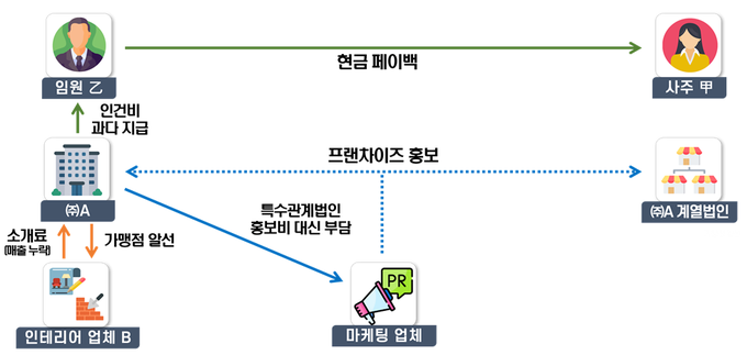 특히, ㈜B가 가맹점 인테리어를 할 수 있도록 가맹점을 연결해 주며 소개비를 받고 있으나, 세금계산서 미발급을 통해 거래를 은폐해 매출을 누락했으며, 임원 乙에게 인건비를 과다 지급하고, 사주 甲은 이 중 일부를 현금으로 되돌려 받는 수법으로 법인자금을 부당유출한 혐의가 밝혀졌다.