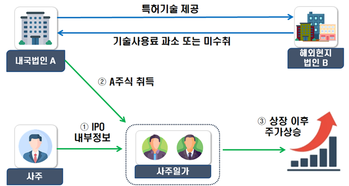또한, 사주일가는 사주로부터 ㈜A의 IPO(기업공개)에 관한 내부정보를 제공받고 사전에 대량의 주식을 취득했으며, 상장 이후 공모가를 훨씬 상회하는 주가흐름을 보이면서, 수십억 원에 달하는 시세차익을 얻었음에도, 증여세 신고를 누락했다.
