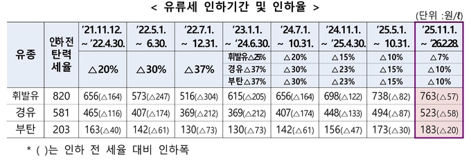 휘발유에 대한 인하율은 7%, 경유·액화석유가스(LPG)부탄은 10%로 동일하다.