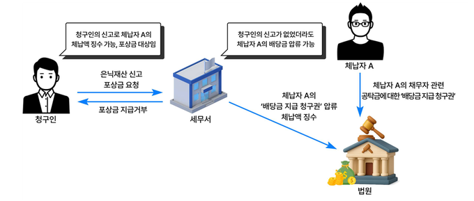 청구인은 세무서에 체납자A가 배당받을 금액이 있으니 이를 압류해 징수하라고 신고하고, 은닉재산 신고 포상금 지급을 요청했으나, 세무서는 청구인이 신고한 자료가 없더라도 체납자A의 배당금은 압류가 가능했다는 이유로 포상금 지급 요청을 거부했다.