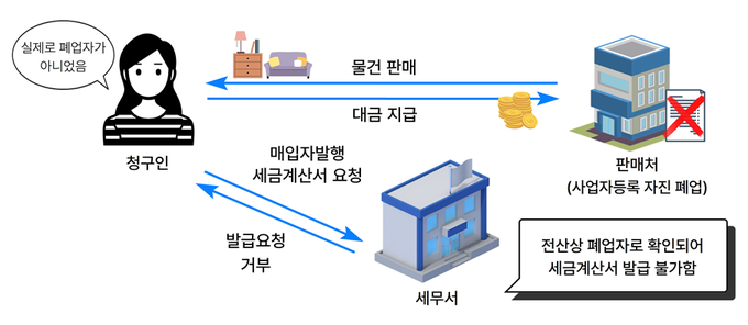 청구인은물건을 구입했으나 세금계산서를 받지 못했다며, 환급에 필요한 매입자발행세금계산서 발급을 세무서에 요청했으나, 세무서는 청구인이 물건을 구입했다고 한 판매자가 사업자가 아닌 폐업자라는 이유로 세금계산서 발급 요청을 거부했다.
