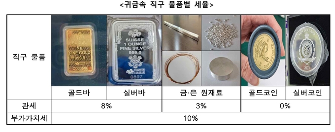 하지만 해외 가격이 국내보다 저렴하다는 이유로 금·은 제품을 덜컥 구매할 경우 예상치 못한 낭패를 볼 수 있다. 흔히 투자용으로 구매하는 골드바·실버바는 금·은 세공품으로 분류돼 8%의 관세와 10%의 부가가치세가 부과되므로, 이러한 세금이 사실상 국내에서 거래되는 물품의 프리미엄보다 더 클 수 있기 때문이다.