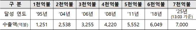 지난 2018년 수출 6천억달러 기록 이후 7년만에 이뤄낸 쾌거이자, 세계적으로 7천억불 달성 국가로는 미국·독일·중국·일본·네덜란드에 이어 6번째다.