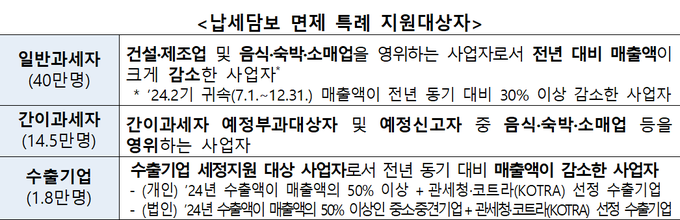 납부기한 직권연장 대상으로는 연간 매출액이 10억원 이하이면서 ‘제조·건설·도매·소매·음식·숙박·운수·서비스 등 국민 실생활과 밀접한 관련이 있는 8개 업종’을 영위하며, 2025년 1기 매출액이 전년동기대비 30% 이상 감소한 사업자에게는 납부기한이 2개월 직권연장된다.