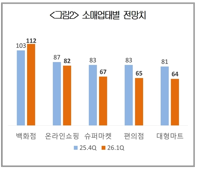 업태별로는 백화점이 기준치(100)를 상회한 반면, 온라인, 슈퍼마켓, 편의점, 대형마트는 모두 기준치를 밑돌았다.