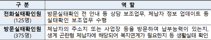 이와함께 생계 곤란형 체납자에게는 경제적 재기 지원 안내에도 나서, 생계가 어려운 체납자가 희망하는 경우 ‘체납액 납부의무 소멸’을 신청할 수 있또록 안내하고, 주거·일자리 등 필요한 복지지원을 받을 수 있도록 연계 신청을 하는 등 복지지원 업무도 맡게 된다.