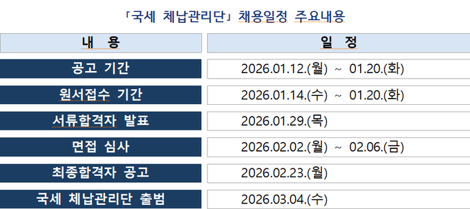 국세청이 공고한 채용일정에 따르면, 원서접수는 1월14일~20일까지 진행되며, 지원을 희망하는 지역의 지방국세청 담당자 이메일 또는 지방국세청에 직접 방문해 접수가 가능하다. 서류합격자 발표는 1월29일이다.