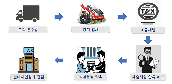 -A는 대전광역시에서 거주하는 트럭 운수업자로 매출 감소로 부가가치세 등 4천만원을 체납하였고, 체납담당공무원은 매출채권 압류예고 통지를 한 상황이다. 실태확인원이 A의 주소지를 방문해 체납액이 기재된 체납안내문을 전달하고, 납부방법을 안내했으며, 실태확인 결과 A는 현재 경기부진으로 매출이 없는 상태이고, 트럭 할부금도 연체된 상태여서 체납 세금을 일시에 납부하기는 어렵지만, 매월 일정 금액을 분납할 것을 약속했다. 실태확인원은 체납담당 공무원에게 A씨의 생활실태를 전달했으며, 체납담당 공무원은 A의 매출채권 압류를 유예했다.