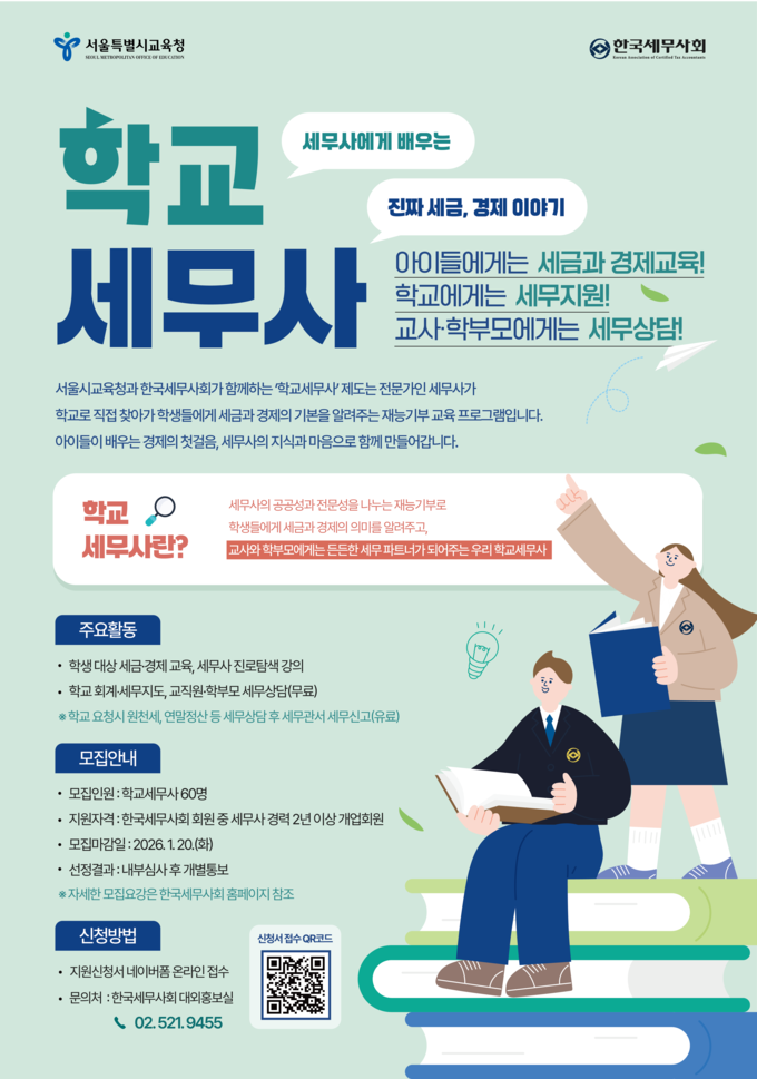 앞서 세무사회는 지난해 10월14일 서울시교육청과 세무사의 공공적 역할을 교육 현장으로 확장하기 위한 학교세무사 업무협약을 체결했다.