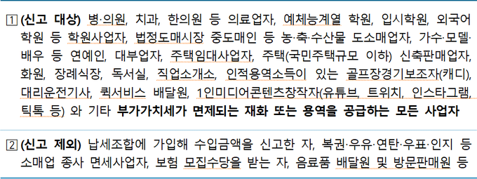 이들 외에도 병·의원과 학원 사업자, 농·축·수산물 도소매업자, 주택 임대업자, 인적용역사업자 등 부가가치세가 면세되는 사업을 영위하는 모든 개인사업자는 오는 2월10일까지 사업장 현황신고를 마쳐야 한다.
