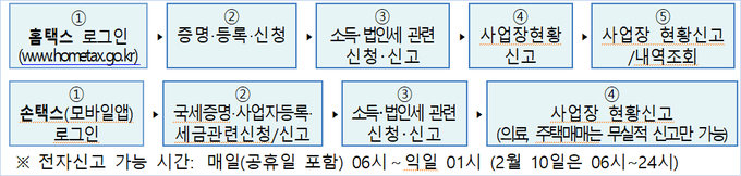 안내를 받은 사업자는 국세청 홈(손)택스에서 제공하는 신고도움자료, 수입금액 미리채움 서비스 등을 통해 세무비용 부담 없이 손쉽게 신고를 마칠 수 있다.