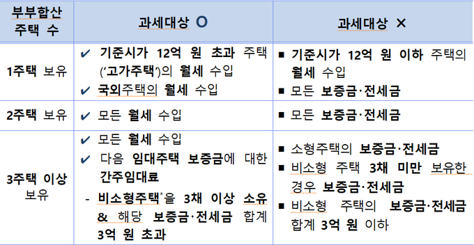 주택임대사업자 과세 대상으로는 월세 수입이 있는 1주택(기주시가 12억원 초과 주택 또는 국외주택), 2주택 이상 보유자와 보증금 등의 합계액이 3억원을 초과하는 3주택 보유자다.