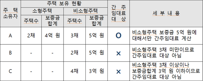 다만, 소형주택(주거전용면적 40㎡ 이하이면서 기준시가 2억원 이하)은 보증금 등에 대해 과세 제외되며, 월세수입은 과세 대상이다.