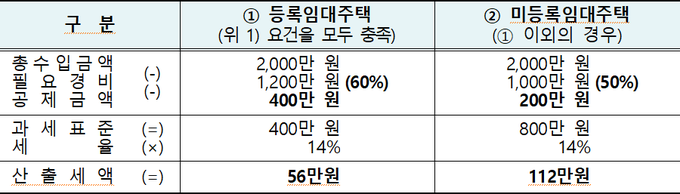 만약 등록임대주택임에도 기재하지 않을 경우 5월 종합소득세 신고 시 필요경비(등록임대 60%, 미등록임대 50%)와 공제금액(등록임대 4백만 원, 미등록임대 2백만 원)을 적게 적용받아 소득세 부담이 커질 수 있다.