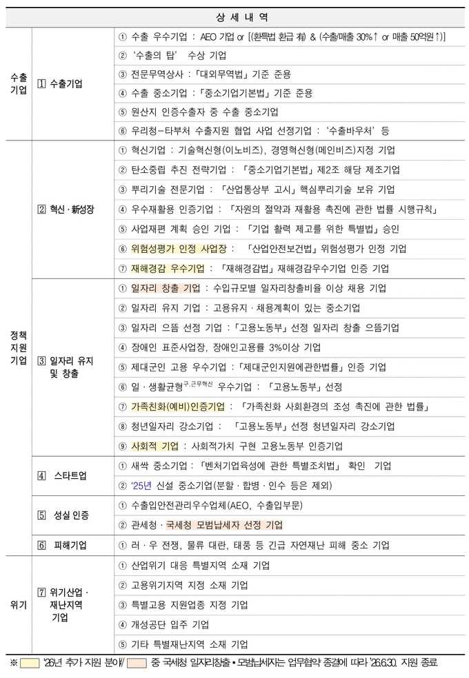 이번 대책으로 사회적기업, 재해·사고 안전 인증기업, 가족친화기업 등 국정과제 연계 기업군 6천193곳이 세정지원대상에 새롭게 포함됐다. 위험성평가 인증사업장 1천75곳, 재해경감 우수기업 296곳, 가족친화 인증기업 1천56곳, 사회적기업 3천766곳이 대상이다.