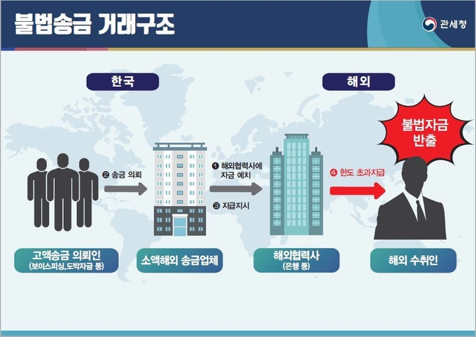 -소액해외송금업자 C씨는 범죄자금(보이스피싱·도박) 등을 해외로 불법송금하기 위해 타인명의 계정, 무기명 가상계좌, 편의점 선불카드 등을 사용하는 수법으로 4천억원을 송금한 사실이 작년 12월 서울세관을 통해 적발됐다.