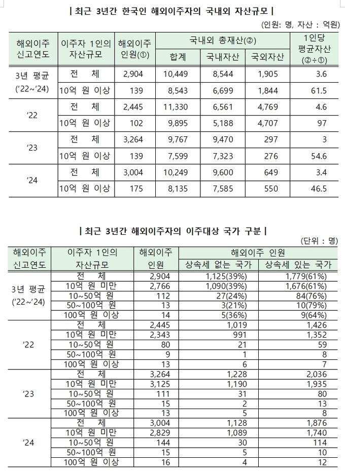 통계에 따르면, 해외 이주자 중 10억 원 이상 보유자는 연평균 139명 수준이고, 1인당 평균 보유 재산 규모도 2022년 97억 원, 2023년 54억6천만 원, 2024년 46억5천만 원으로 감소 추세에 있다.