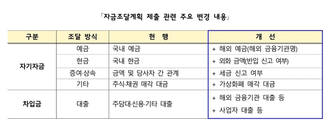 자금조달계획 신고내용에는 해외예금, 해외대출 및 해외금융기관명 등 해외자금 조달내역이 추가됐으며, 기타자금 조달내역에는 주식·채권 매각대금뿐만 아니라 가상화폐 매각대금까지 포함된다.