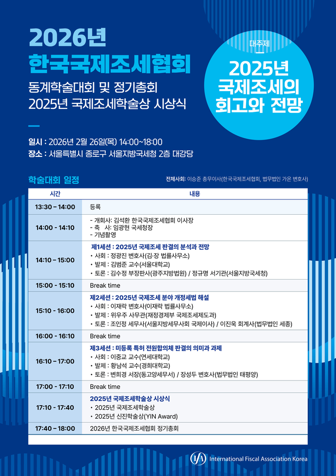 학술세션 종료 후에는 ‘2025년 국제조세학술상 시상식’이 진행된다. 올해의 국제조세학술상과 신진학술상(YIN Award) 시상이 이뤄지며, 이후 2026년도 정기총회를 끝으로 행사가 마무리될 예정이다.