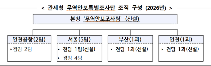 신설된 무역안보조사팀은 불법행위에 총괄 대응하는 조직으로 지난연말 인천·부산·서울세관 등에 신설된 세관 무역안보 수사 조직과 함께 무역안보 침해 범죄 수사를 전담하게 된다.