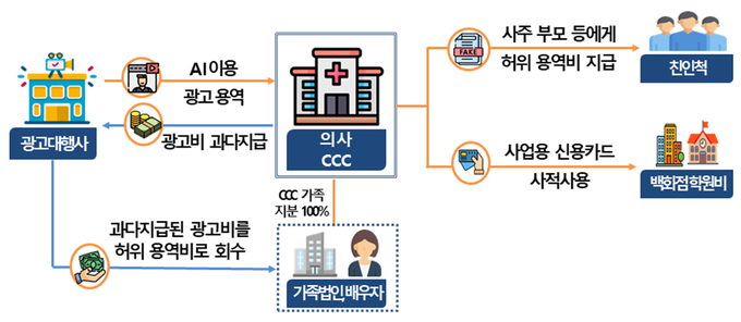 - CCC는 유튜브에서 인공지능(AI)으로 생성한 허위·과장 의료광고로 환자를 유치하고 있으며, 광고대행업체에 광고비를 과다하게 지급해 영업비용을 부풀리고 이를 가족 지분이 100%인 특수관계법인과 배우자를 통해 회수했다.