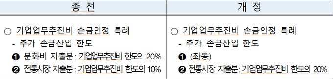 이외에도 전통시장에서 법인카드로 기업업무추진비를 지출한 경우 종전에는 손금산입 한도액의 10% 범위 내에서 추가로 손금산입 가능했으나, 한도 비율이 20%로 상향되는 등 전통시장 활성화 지원 폭이 늘었다.