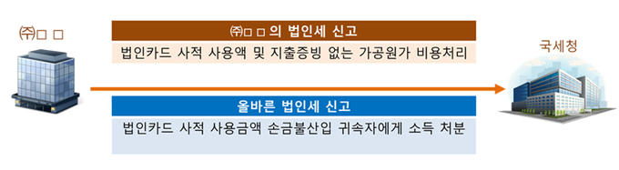 국세청은 법인의 신용카드 사용자료 중 사적사용 개연성이 높은 ①신변잡화 ②가정용품 구입 ③업무무관업소 이용 ④개인적 치료와 해외사용액에 대해 비용 처리하지 않도록 사전 안내하고 있다.