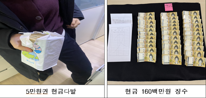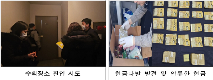 수색 결과, 옷장·화장대 수납 공간 곳곳에 분산해 숨겨놓은 5만원권 현금, 아파트 베란다 종이박스 안에 5만원권 현금다발 2개 등 5만원권 2천200장 총 1억1천만원을 징수했다.