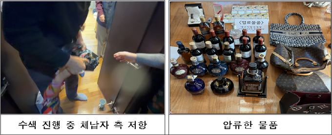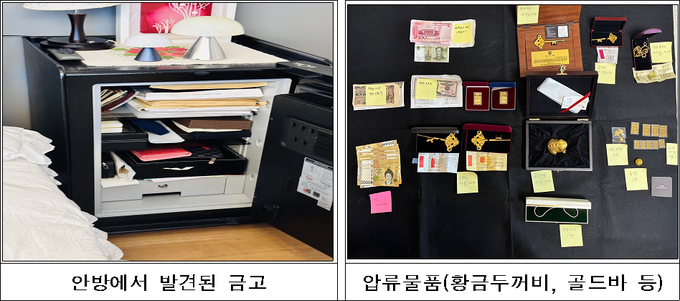 수색 결과, 드레스룸에서 비닐봉지에 보관한 현금뭉치, 고가시계, 명품가방, 금(54돈), 목걸이 등 총 1억원 상당의 재산을 발견해 압류했다.