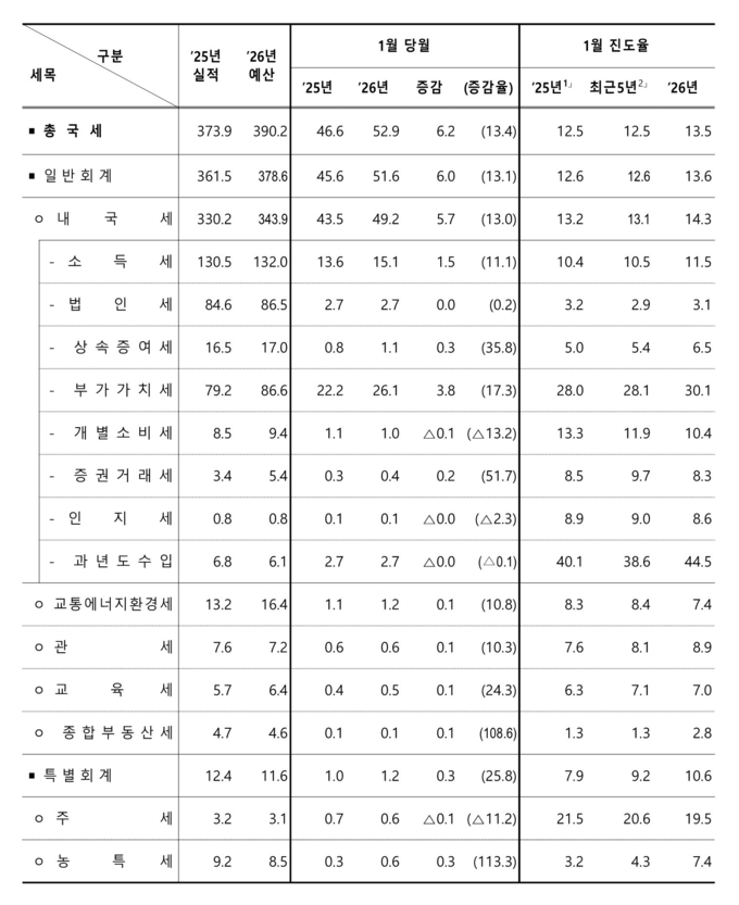 27일 재정경제부가 발표한 ‘2026.1월 국세수입 현황’에 따르면, 1월 국세수입은 52조9천억원으로 나타났다. 진도율(세수목표 대비 징수율)은 13.5%로, 작년 같은 기간(12.5%)보다 1% 포인트 상승했다.