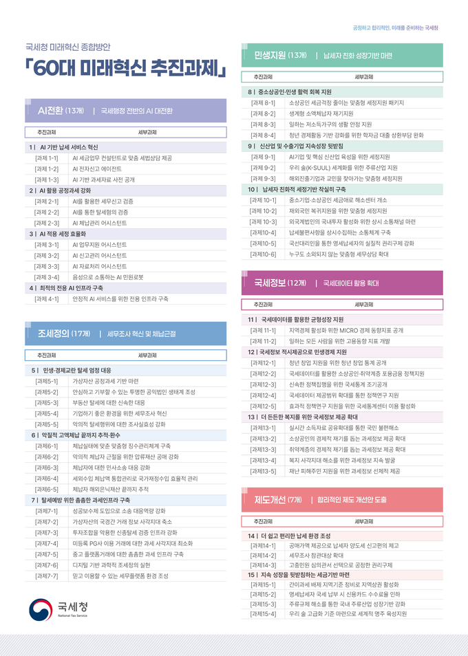 국세청이 발표한 각 분야별 추진과제는 △국세행정 AI 대전환(11개 과제) △조세정의 구현(17개 과제) △민생·성장 지원(13개 과제) △국세정보 적극 공개(12개 과제) △현장중심 제도 개선(7개 과제) 등이다.