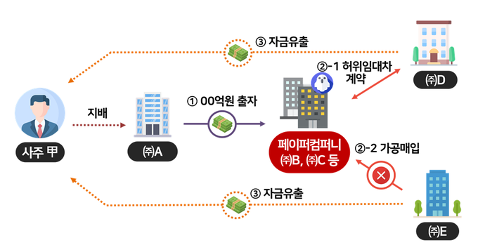 ㈜B는 ㈜D와 허위 임대차계약서 등을 작성해 00억원을 빼돌려 사주 甲에게 제공하고, ㈜C는 매출이 전무한 부실회사 ㈜E로부터 00억원의 가공세금계산서를 수취하는 방법으로 법인자금 유출했다.