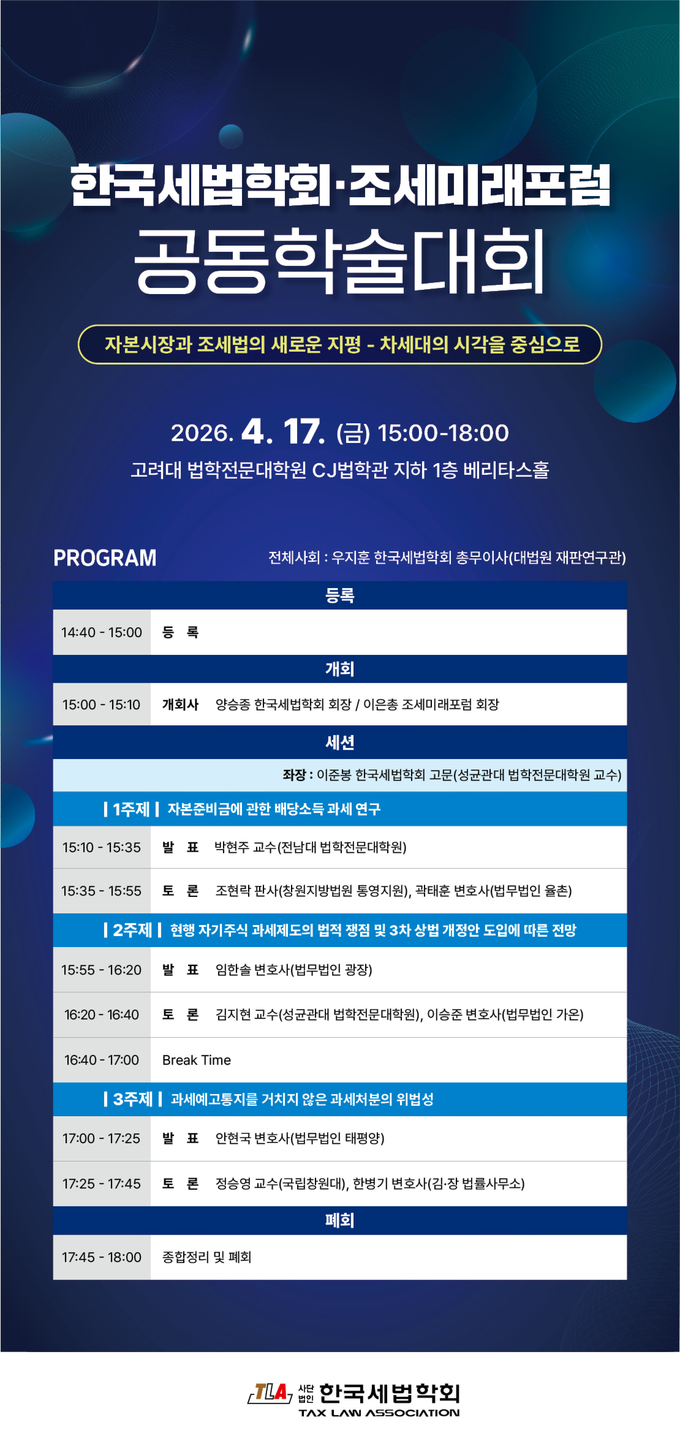 1주제는 '자본준비금에 관한 배당소득 과세 연구'를 박현주 전남대 법학전문대학원 교수가 발표한다. 조현락 창원지방법원 통영지원 판사와 곽태훈 법무법인 율촌 변호사가 토론자로 나선다.