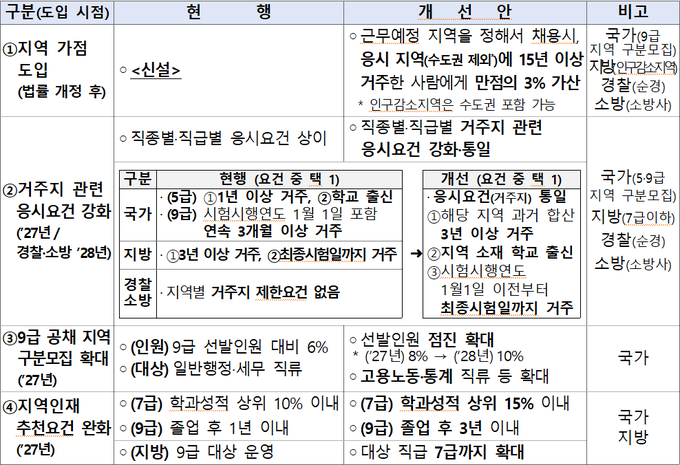 우선적으로 지역 출신 인재 우대 강화를 위해 국가직 9급 공채 지역 구분 모집 등 근무 예정 지역을 정해서 채용하는 경우 해당 지역(수도권 제외)에서 장기 거주한 사람에게 가점을 부여하기로 했다.