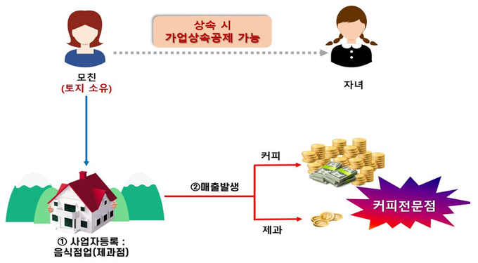 일례로 서울 근교의 300억원 상당 토지를 외동 자녀에게 그대로 상속하면 약 136억2천만원의 상속세를 내야 한다. 하지만 이곳에 대형 베이커리카페를 차려 10년간 운영한 뒤 자녀가 물려받아 5년 이상 운영하면 상속세는 ‘0원’이 된다.