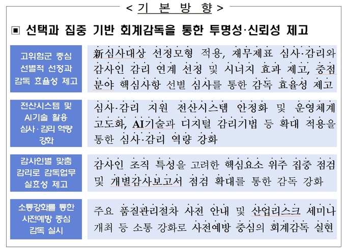 올해 회계심사·감리업무 기본 방향으로는 ▶회계 위반 고위험군 중심의 선별적 선정 ▶전산시스템 및 AI 기술 등 활용 ▶감사인별 맞춤 감사인 감리 ▶사전 예방 중심의 감독 등을 제시했다.