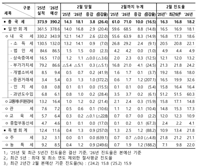 2월 한달 기준으로는 18조1천억원 걷혔다. 지난해 같은 기간 대비 3조8천억원 증가한 규모다.