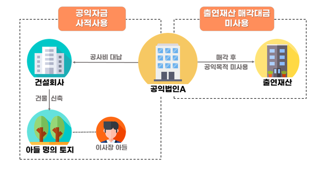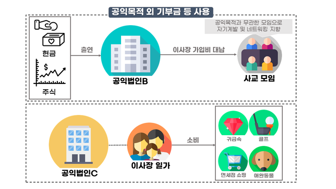 일례로, 공익법인 이사장의 자녀 명의로 건물을 신축하면서 공익법인 자금으로 건물 공사대금을 대납하거나, 이사장의 사교 목적으로 운영되는 모임 가입비를 공익법인이 대납하고 이사장 일가가 귀금속·면세점 쇼핑, 골프장 이용, 애완동물 및 피부미용 관련 용품 구매시 법인 신용카드로 사적 사용한 사례도 드러났다.