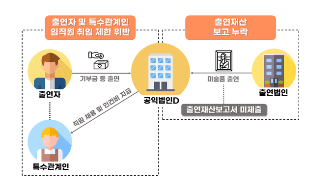 공직자금을 부당 거래하는 등 의무 위반사례도 밝혀져, 출연자의 배우자·자녀 등 특수관계인을 공익법인의 임직원으로 고용해 인건버 등의 경비를 지급하거나, 출연재산을 매각한 후 현금화한 경우 3년 이내에 직접 공익목적사업에 사용해야 함에도 매각대금 일부를 공익목적 사업에 미사용한 사례도 적출됐다.