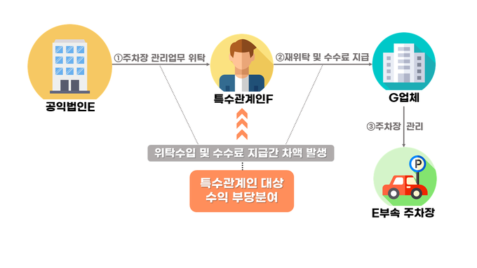 -공익법인 E는 특수관계인 F에게 공익법인 소유의 건물 부설 주차장의 운영을 위탁하고, 특수관계인 F는 G업체에 주차장 관리를 재위탁하여 G업체가 특수관계인 F를 대신해 주차장을 실제로 관리하게 했다.