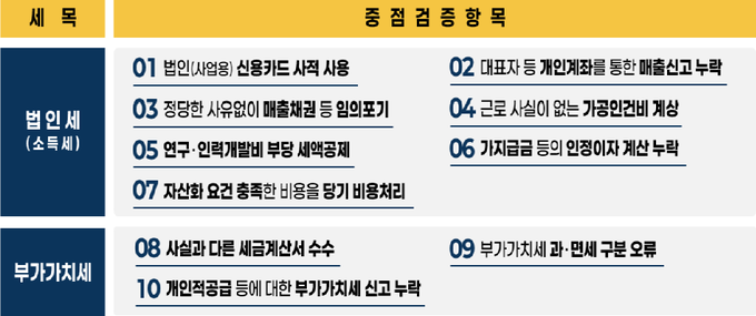 국세청은 또한 세무조사 과정에서 반복적으로 과세되는 10개 유형을 ‘중점검증항목’으로 선정해 공개한다.