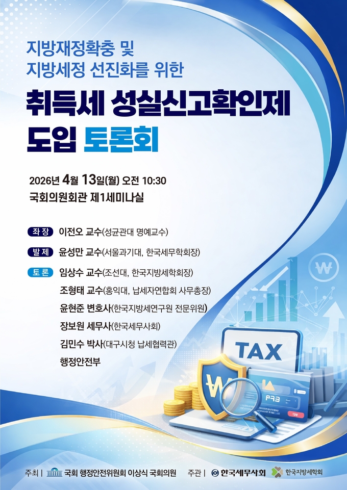이상식 의원(행정안전위원회, 더불어민주당)이 주최하고, 한국세무사회와 한국지방세학회가 공동 주관하는 ‘지방 재정 확충 및 지방 세정 선진화를 위한 취득세 성실신고확인제 도입 토론회’가 오는 13일 국회의원회관 제1세미나실에서 개최된다.