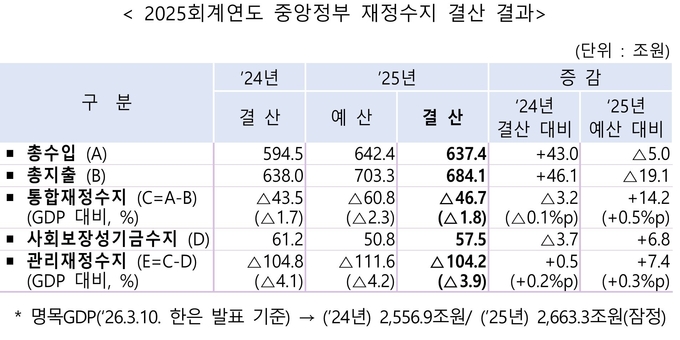 총수입 637조4천억원에서 총지출 684조1천억원을 차감한 통합재정수지는 46조7천억원 적자를 기록했다.