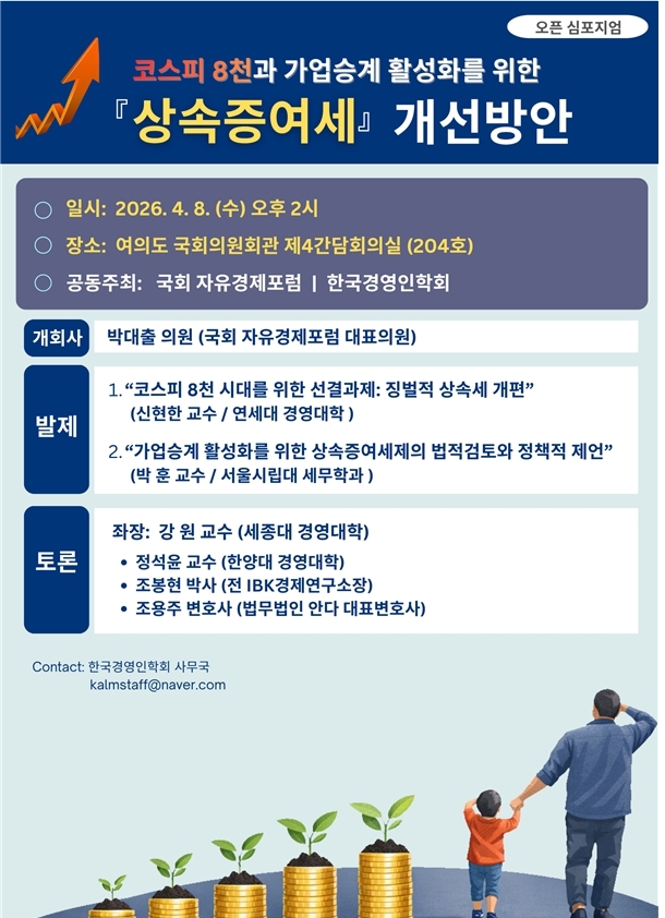 국회 자유경제포럼(대표의원·박대출)과 한국경영인학회(학회장·이웅희 한양대 교수)는 오는 8일 국회의원회관 제4간담회실에서 ‘코스피 8천과 가업 승계 활성화를 위한 상속증여세 개선방안’을 주제로 심포지엄을 개최한다.
