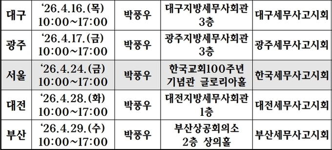 전국 순회 교육은 오는 16일 대구(대구지방세무사회관 3층), 17일 광주(광주지방세무사회관 3층), 24일 서울(한국교회100주년기념관 글로리아홀), 28일 대전(대전지방세무사회관 1층), 29일 부산(부산상공회의소 2층 상의홀)에서 진행된다.