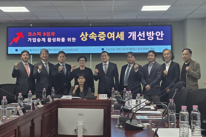 국회 자유경제포럼과 한국경영인학회는 8일 국회의원회관 제4간담회의실에서 ‘코스피 8천과 가업승계 활성화를 위한 상속·증여세 개선방안’ 심포지엄을 개최했다.