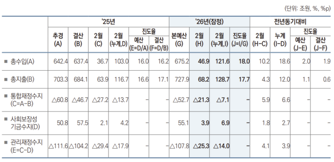 기획예산처가 9일 발표한 월간 재정동향 4월호에 따르면, 2월말 누계 총수입은 121조6천억원으로 전년 동기 대비 18조6천억원 증가했다. 진도율은 18.0%를 기록했다.